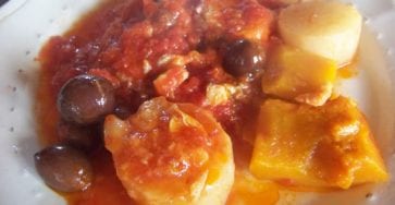 Une morue à l’italienne avec une sauce tomate, ail, oignons, olives, piment, courge et navets, pour ce plat aussi bon qu’original.
