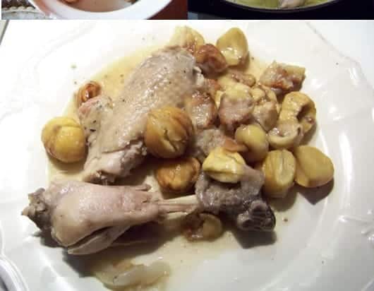 Laissez refroidir quelques minutes (ça brûle !) et pelez les châtaignes. Coupez le poulet en morceaux, mettez les ailes, les cuisses et les blancs dans une cocotte, mettez par dessus la carcasse. Ajoutez l’oignon coupé en morceaux, un bâton de cannelle de 3cm de long, sel, deux tasses d’eau et 3 C.A.S d’huile d’olive.