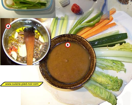 3 – Dans une casserole mettez tous les ingrédients de la sauce. Faites cuire à petit feu pendant quelques minutes, jusqu’à ce que les anchois aient fondu dans l’huile et les gousses d’ail ramolli.