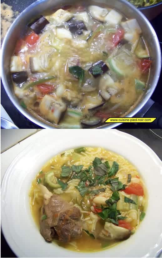 • 1 aubergine, 1 courgette, 1 oignon, 2 tomates, 1 morceau de courge, 2 gousses d'ail, 1 tasse de vermicelles, de riz rond ou de pâtes plombs, 1 tasse de lentilles, orge perlé ou de blé noir, 4 manchons de canard confits, quelques feuilles de basilic, sel, poivre