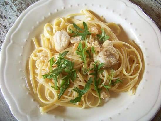 Linguine aux joues de loup, crevettes et roquette
