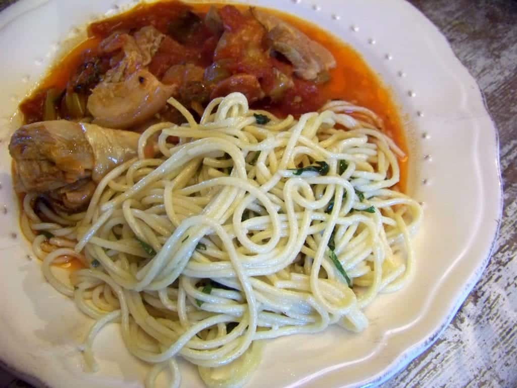 • Servez avec du riz, ou comme sur la photo, des spaghetti sautés rapidement avec de l’ail et du basilic ajouté à la fin.