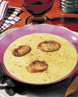 3.Quand la soupe est cuite, versez peu à peu une louche du liquide bouillant sur les œufs, sans cesser de mélanger, puis versez d’un seul coup le contenu du bol dans la soupe. Vérifiez l’assaisonnement en sel et en poivre, dégustez très chaud sans attendre avec les tranches de pain grillées frottées d’ail.