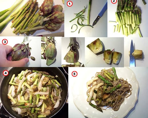 3 – Hachez les oignons blancs et l’ail et faites revenir tous les légumes avec la seiche à l’huile d’olive ou au beurre. Ajoutez 1/2 verre d’eau ou de vin blanc, salez, poivrez, et laissez cuire 10mn, jusqu’à ce que les légumes deviennent tendres, mais encore un peu croquant. Pendant la cuisson, faites cuire les pâtes dans une grande quantité d’eau salée,égouttez-les et mélangez les pâtes avec les légumes dnas la poêle, en faisant sauter le tout quelques instants.