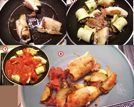 A ce moment de la recette, s’il vous reste de la farce vous pouvez compléter avec des paupiettes de courgettes : coupez une courgette en bandes de 4mm d’épaisseur, passez-les 1mn30 au micro-ondes pour les ramollir, enroulez-les et piquez avec un cure-dent pour fixer le tout.