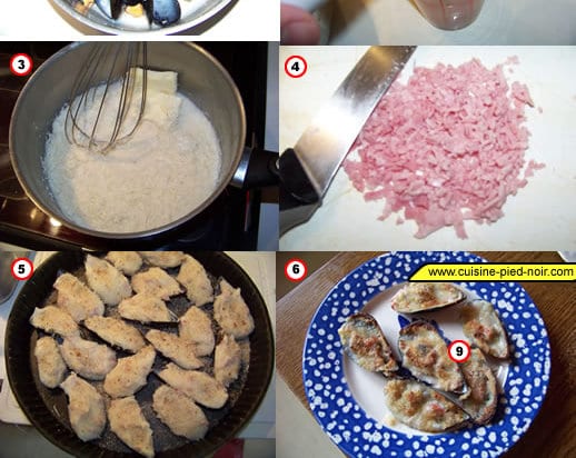 Faites ouvrir les moules préalabelemnt nettoyées dans un faitout avec 1/3 du vin blanc. Remuez les moules plusieurs fois jusqu’à ce qu’elles soient toutes bien ouvertes. Sortez-les à l’écumoire, et mettez-les dans un égouttoir sur une assiette creuse (vous récupèrerez le jus restant dans l’assiette passez le jus des moules et laissez refroidir. Pendant ce temps, hachez le persil et pressez l’ail. Dans un verre doseur, mettez le jus des moules, ajoutez le vin blanc, complétez avec du lait jusqu’à obtenir 30cl de liquide.