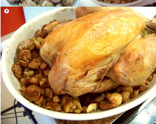 Mettez le poulet dans un plat. Fourrez le poulet avec les châtaignes brisées, et disposez les plus belles châtaignes tout autour du poulet. Salez légèrement, répartissez quelques noix de beurre, autour du poulet, ajoutez 2 C.A.S. d’eau. Badigeonnez le poulet d’un peu d’huile avec un pinceau. De cette façon il sera bien doré (surtout si vous avez un four à chaleur tournante – peste soit de celui qui a inventé ce type de four)