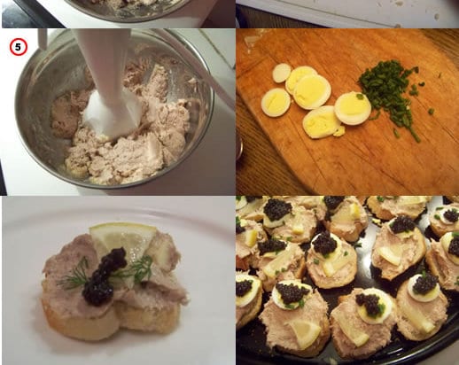 Pour la décoration : sur les rillettes de sardines ajoutez un fin triangle coupé dans une tranche de citron une petite branche d’aneth et quelques oeufs de lump. Sur les rillettes de thon ajoutez une tranche d’oeuf de caille, un peu de ciboulette hachée et quelques oeufs de lump. Servez avec un bon vin blanc de Loire sec et bien frais.