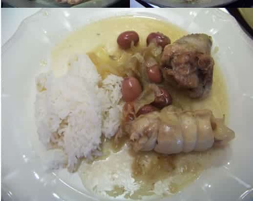 Coupez les oignons en demi-lunes et faites-les dorer légèrement dans une cocotte avec de l’huile d’olive ou du beurre. Otez les oignons et faites revenir le poulet. ajoutez à nouveau les oignons sur la viande, salez et poivrez, ajoutez le vin blanc, et faites mijoter 45mn à couvert. 10mn avant la fin, ajoutez les olives. Rectifiez l’assaisonnement, laissez réduire la sauce si elle est trop abondante.