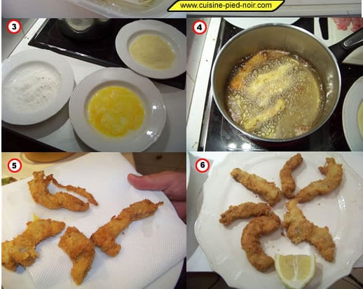 Faites chauffer la friture, plongez les morceaux alternativement dans la farine, l’oeuf battu puis la chapelure et faites frire à grande friture jusqu’à ce que les morceaux soient bien dorés. Epongez soigneusement avec du papier absorbant pour éliminer le maximum de graisse. Salez et servez brûlant avec des quartiers de citron