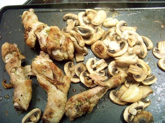 4 pilons de poulet (ou plus suivant la taille), 500g de champignons de Paris, romarin ou herbes de Provence, sel, poivre