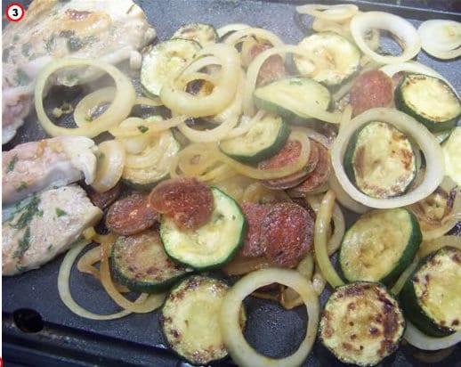 Emincez les courgettes et mettez-les à cuire sur la plancha. Salez et laissez cuire les courgettes quelques minutes. Ajoutez les oignons, puis quand les oignons commencent à cuire le chorizo en lamelles. Remuez régulièrement jusqu’à ce que tout soit cuit. En remuant, le jus qui s’échappe du chorizo va parfumer les légumes.