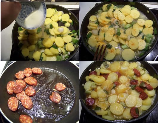 10mn avant la fin, coupez le chorizo en tranches, faites-le revenir dans une poêle, et ajoutez les tranches de chorizo avec les pommes de terre, laissez jusqu’à la fin de la cuissone