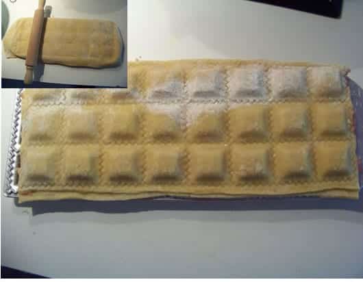 Si vous avez un moule à ravioli (voir photo) posez un rectangle de pâte sur le moule et remplissez les petites alvéoles de farce. Posez dessus un autre rectangle et soudez les raviolis en passant le rouleau par dessus.
