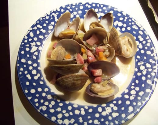 palourdes aux lardons, coriandre et petits légumes