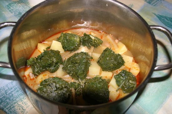 Dans la marmite on met les côtes de blettes, les cocos, la purée ail/pimenton, sel et poivre on recouvre d’eau et on laisse mijoter à feu doux