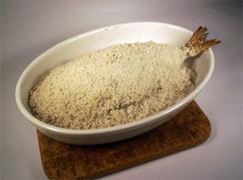 sel. Après avoir traversé la croûte de sel, si le cure-dent ne rencontre pas de résistance jusqu’à l’arête c’est que le poisson est cuit.