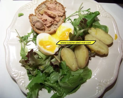 100g de foie gras, 8 pommes de terre, salade verte nettoyée et coupée, 4 oeufs, toasts ou tranches de pain