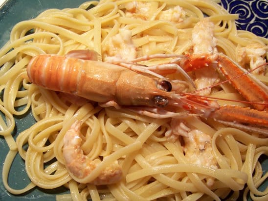 Sortez les pâtes très al dente et mettez-les quelques minutes dans la poêle à feu vif en remuant sans arrêt avec le jus pour qu’elles finissent de cuire en s’imprégnant du jus de langoustines.