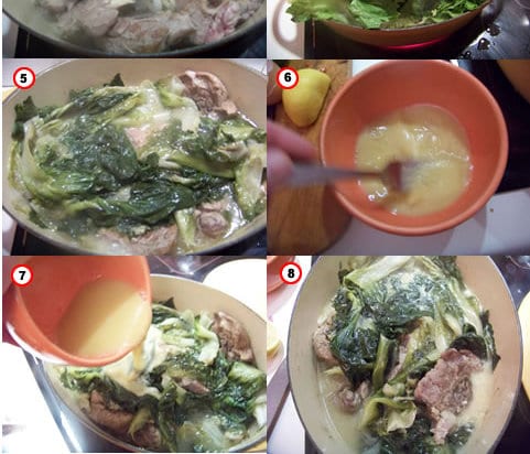 Hachez l’ail et les oignons blancs, coupez la salade en lanières. Faites revenir les morceaux de viande avec un peu d’huile d’olive et les oignons hachés, quand ils sont dorés, ajoutez la salade, ajoutez 2 verres d’eau, salez, poivrez et laissez cuire 1h.