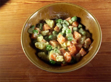 Après avoir été à la mode en France dans les années 60, on ne trouve plus guère cette recette sur les tables, il faut aller en Espagne pour en voir, ce qui n'est pas le moindre des paradoxes pour une salade "russe". Autant cette recette est quelconque avec une macédoine de légumes en boîte autant elle est excellente avec des légumes qui ont cuit individuellement, et qui ont conservé chacun son goût individuel, avec juste le temps de cuisson approprié, pour que le légume garde un peu de sa fermeté. Bien sûr, faites aussi vous mêmes la mayonnaise, et vous obtiendrez quelque chose de vraiment très bon !