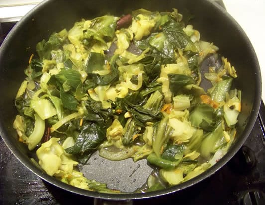 Remuez bien, et laissez cuire à couvert pendant environ 20mn, ou jusqu’à ce que le chou soit bien tendre.
