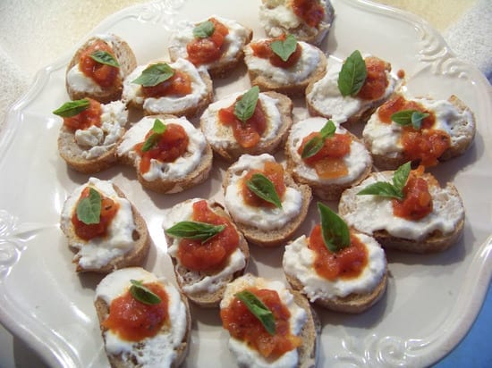 Ecrasez à la fourchette le bleu avec la crème fraîche, tartinez les tranches de baguette. Déposez sur chaque tranche une C.A.C. de tomate concassée, finissez avec un tour de moulin. Décorez avec une petite feuille de basilic.