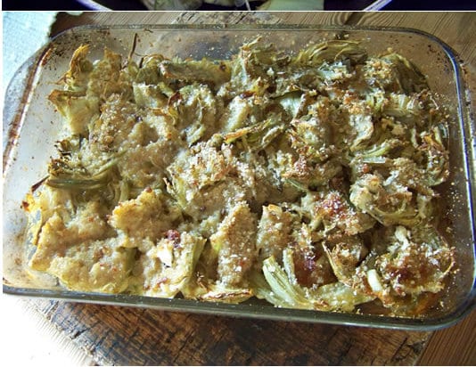 • 8 petits artichauts , 1 verre d'eau ou de vin blanc sec, 2 gousses d'ail, huile d'olive, sel, poivre, chapelure, le jus d'1 citron