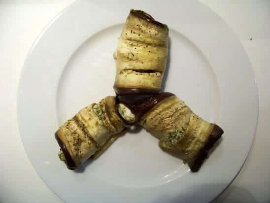 Prenez une tranche d’aubergine, posez un petit tas de farce du côté le plus large et roulez-la. Posez ensuite le rouleau dans le plat, avec le bord en dessous, de façon à ce que le rouleau ne se déplie pas.