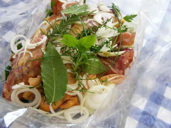 2 /Déposer les oignons, les herbes , le sel et le poivre. dans le fond du sac .