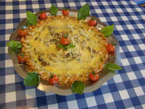 4/Garnir ensuite cette pâte sur le fond de la tarte, des champignons et des crevettes tout autour. Verser,dessus le mélange œufs-créme fraîche. Saupoudrer de gruyére râpé.