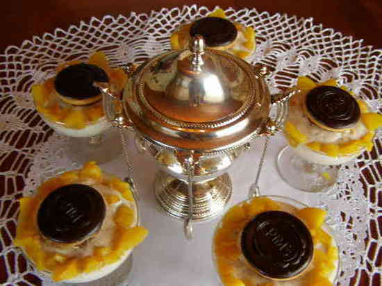 5/Dans chaque verrine, mettre la préparation ci-dessus,1 pim’s au centre et,autour, 1c à c de pêches découpées en petits dés
