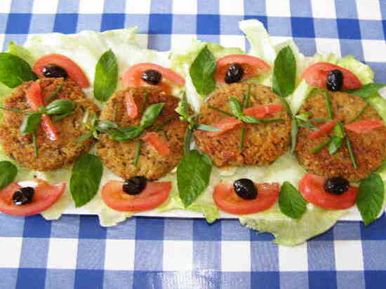 7/Disposer sur des feuilles de salade les palets de Quinoa arroser chaque palet d’une cuillere à soupe de citron.Entourer le plat de quelques tranches de tomates.
