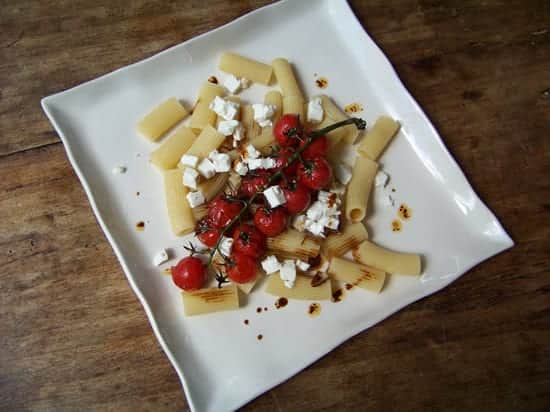 Disposez les pâtes dans les assiettes, ajoutez par dessus les tomates, un cuillère ou deux de sauce et la feta émiettée. Bon appétit !