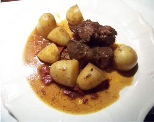 Portez à ébullition, couvrez et laissez cuire à petit feu pendant 2h30. Salez, ajoutez les pommes de terre coupées en deux et épluchées si ce ne sont pas des pommes de terre nouvelles. Laissez encore cuire 30mn à couvert, ou jusqu’à cuisson des pommes de terre.