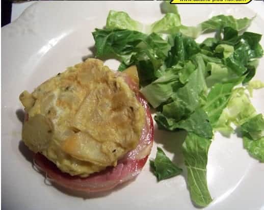 Pendant ce temps cassez les oeufs, battez-les avec sel et poivre. Ajoutez les oignons et pommes de terre revenus et mélangez. Faites chauffer à nouveau la poêle avec un peu de matière grasse. Posez un moule en métal sur la poêle (manipulez avec des pinces pour en pas vous brûler). Versez ensuite un peu du mélange de tortilla. Laissez le moule quelques instants, le temps que la tortilla prenne bien d’un côté, puis ôtez le moule et retournez la mini-tortilla avec une spatule. Laissez cuire de l’autre côté, pendant que vous préparez la seconde mini-tortilla. A la fin poêlez les tranches de pancetta et dans chaque assiette mettez un tranche de pancetta entre 2 couches de tortilla. Servez en tapas ou à table avec une salade.