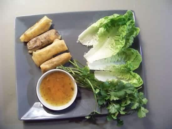 Faites ensuite frire les boreks, et servez avec des feuilles de salade, des feuilles de coriandre, et éventuellement une petite sauce chinoise à nems (ici une sauce asturienne au cidre qui va très bien avec mais qui est difficilement trouvable en France)