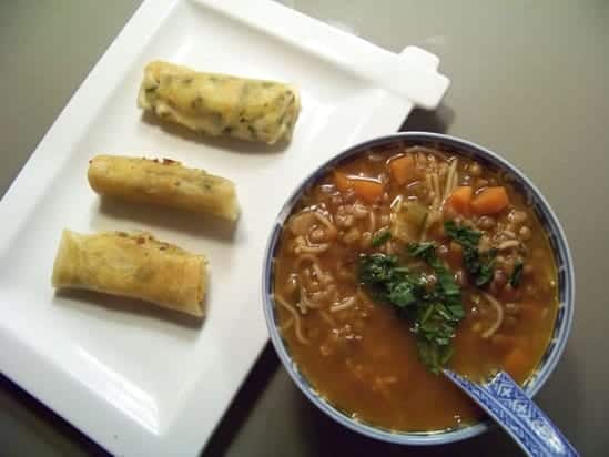 2 carottes, 1 oignon, 2 branches de céleri, un bouquet de coriandre, 2cm d'écorce de cannelle ou 1/2 c.a.c. de cannelle en poudre, 50g de riz rond, 50g de lentilles, 50g de blé noir ou d'orge perlé, ou l'équivalent de pois chiches déjà cuits, (dans ce cas on ne les ajoutera qu'à la fin), 50g de vermicelles ou de pâtes plombs (berkoules) 500g de coulis de tomate, 1c.a.c. de carvi, sel, poivre, huile d'olive, 1l de bouillon ou d'eau, 1 citron