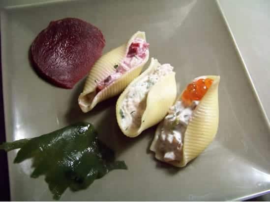 Déposez 3 conchiglioni différents par assiette, décorez avec des algues (photo), une fine rondelle de betterave, ou desu feuilles de salade.