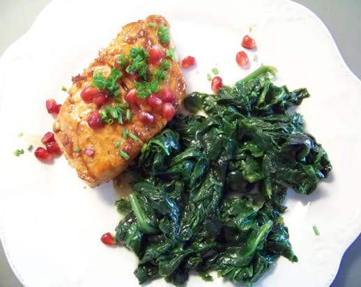 Servez avec par exemple des épinards frais revenus au beurre comme sur la photo. Si vous en avez sous la main, ajoutez quelques algues réhydratées avec les épinards, pour leur donner un délicat goût iodé.