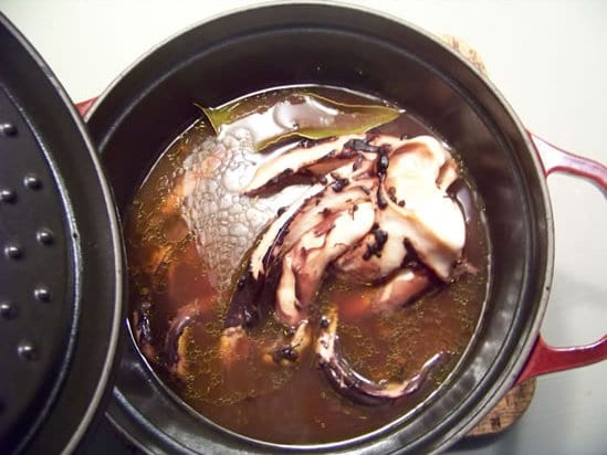 Faites éventuellement réduire le bouillon sur le gaz en fin de cuisson après avoir ôté le poulpe.