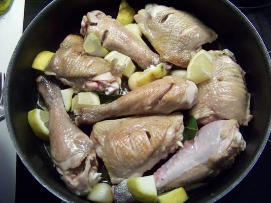Faites dorer le poulet à l’huile d’olive, de chaque côté. Ajoutez alors tous les ingrédients, baissez le feu au minimum, couvrez et laissez cuire pendant une heure.