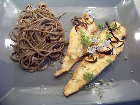 Quand les filets sont dorés des deux côtés éliminez le surplus d’huile, ajoutez l’ail et le piment réservés, arrosez avec le jus de citron vert, laissez réduire le jus quelques secondes en secouant la poêle de façon à ce qu’il se répartisse bien. Décorez avec la coriandre et servez avec par exemple un riz blanc ou des pâtes japonaises au sarrasin comme sur la photo.
