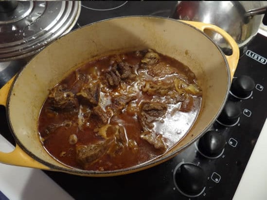 Faites cuire à couvert, à petit feu pendant 3H à 3h30, jusqu’à ce que la viande soit parfaitement tendre.