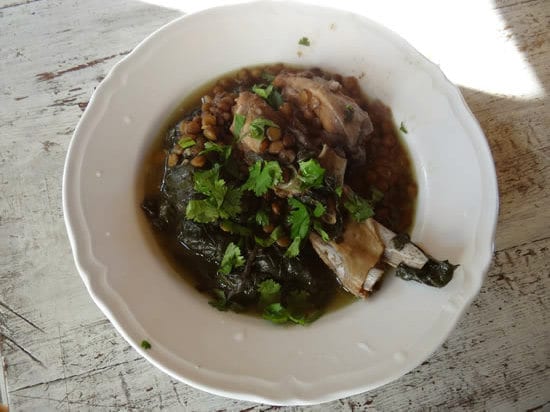 Faites cuire 30mn la viande, écumez au besoin. Ajoutez le bouquet de coriandre, les feuilles de blettes coupées en lanières, les lentilles, le piment.