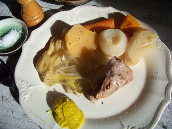 Mettez le jarret de veau à cuire avec le bouquet garni et tous les légumes sauf les pommes de terre et la courge. Laissez mijoter à petit feu pendant 3h.