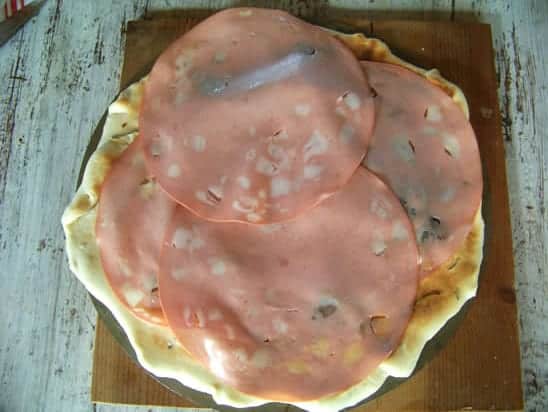 Disposez sur la pâte les tranches de mortadelle, et les coeurs d’artichauts.