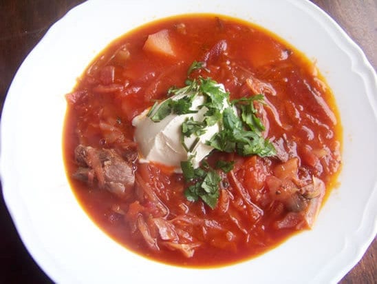 bonjour, votre borsch est très bon et complet, seulement voilà, tous les russes ne sont pas fortunés, Il existe donc un borsch à base de pot au feu (viande de boeuf) sans chou, sans pomme de terre, seulement fait de betteraves rapées une ou deux, en hiver les fans ou les feuilles de betteraves suffisent, oignons et les épices, un poireau. c’est tout. pendant que la viande cuit, on prépare une pate oeuf , de la farine et un peu de levure chimique,ou boulanger mais il faudra attendre sa levée, du sel. On aplatit au rouleau la pate et on y fait des petits patés que l(on remplit de la viande de pot au feu hachée et avec l’oignon; c »est t ce qu’on appelle « pastechtikis » (pardon pour la faute, cela fait 20 ans que je parle plus la langue) Ensuite on passe un peu de jaune d’oeuf pour doré et on fait cuire ces patés au four. On passe à table un bol de borsch et on mange ou on tremp les petits patés dans la soupe bon appétit