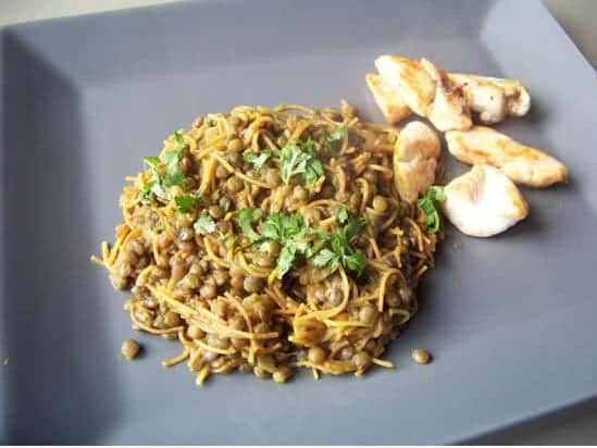 Faites roussir les vermicelles dans l’huile. Quand ils sont bien cuits, couvrez d’eau, ajoutez le curcuma, les lentilles cuisinées, salez poivrez ou pimentez suivant le goût.