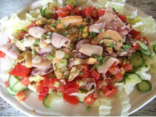 Ajoutez par dessus les moules, les calamars et les crevettes décortiquées.